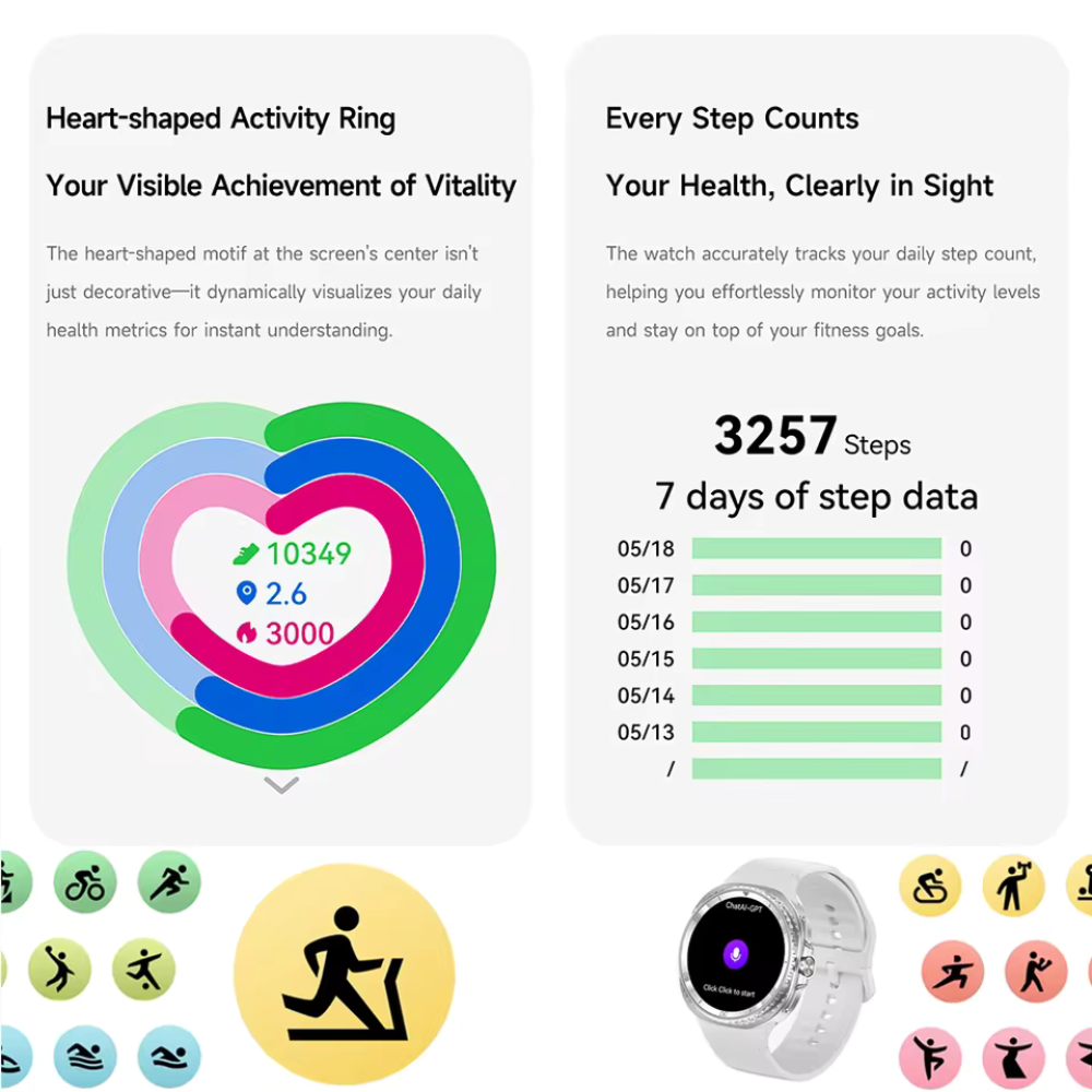 This smartwatch offers comprehensive health tracking including heart rate monitoring, SpO₂ (blood oxygen), blood pressure monitoring, sleep tracking, women’s health tracking, step counting, calories burned, and distance tracking. Multiple sports modes help you track workouts accurately and stay motivated.