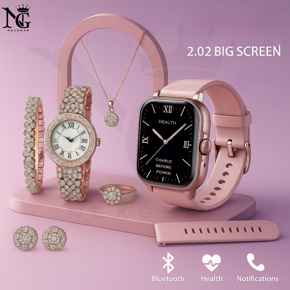 Along with the smartwatch, the elegant gift box includes a stylish gold-plated jewelry set (bracelet, ring, necklace, earrings) and an extra strap, making it a perfect gift for yourself or a loved one.